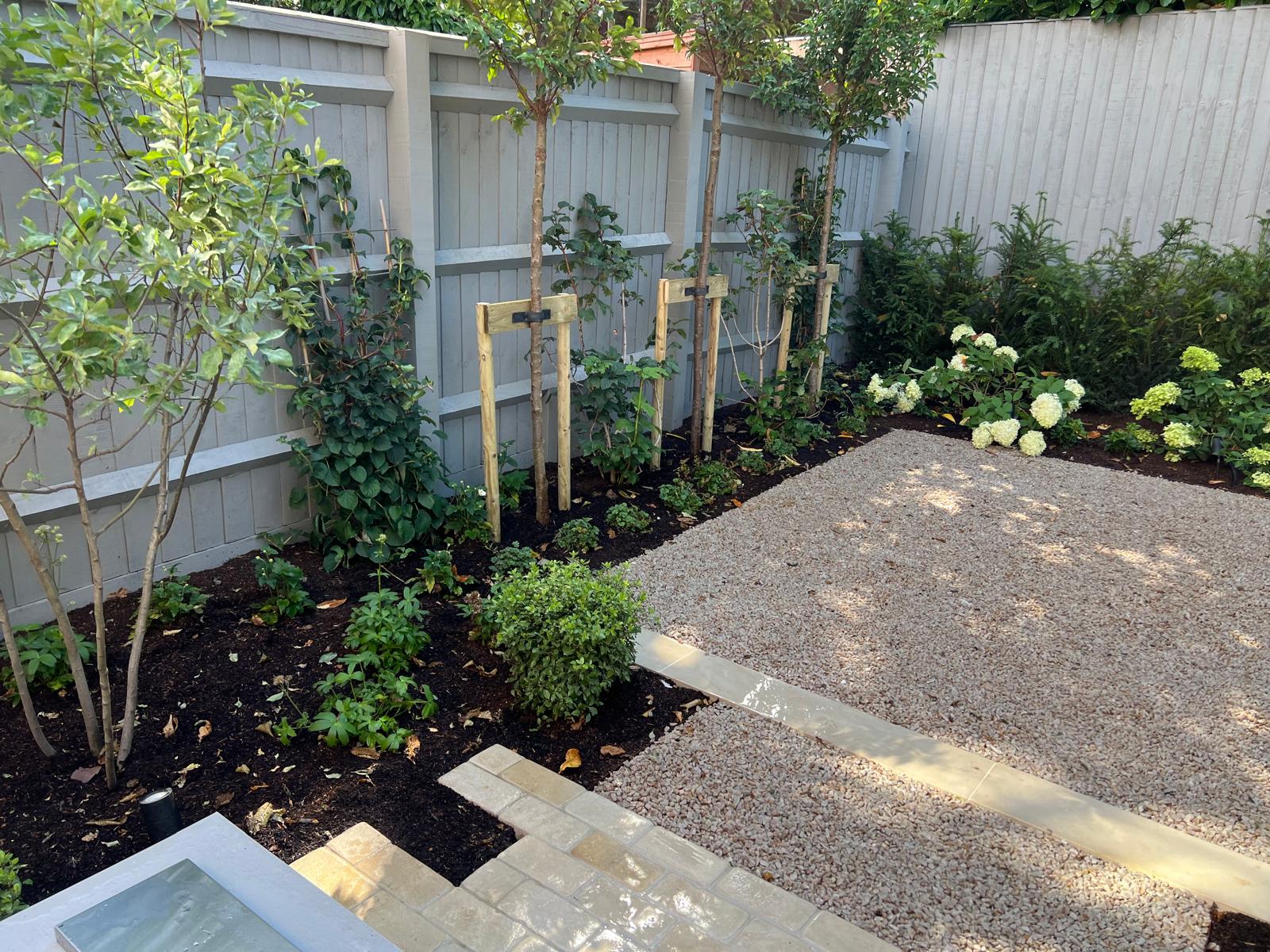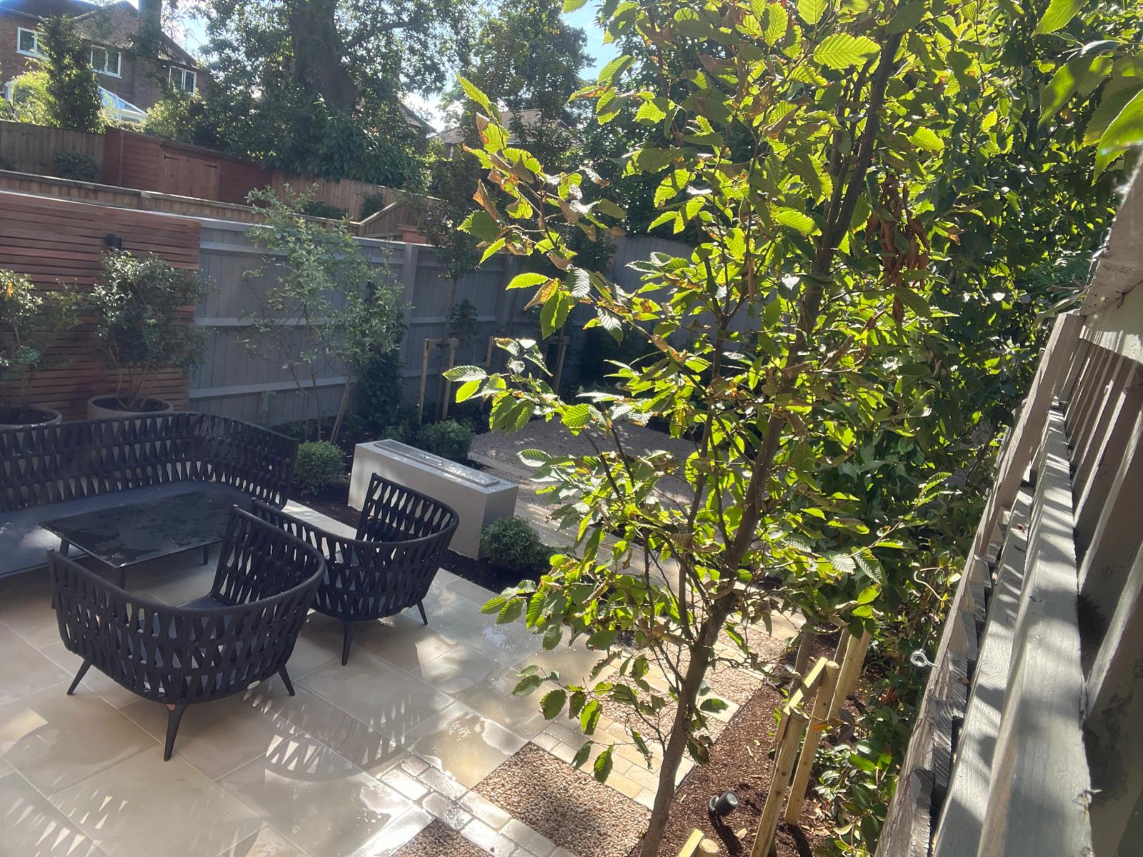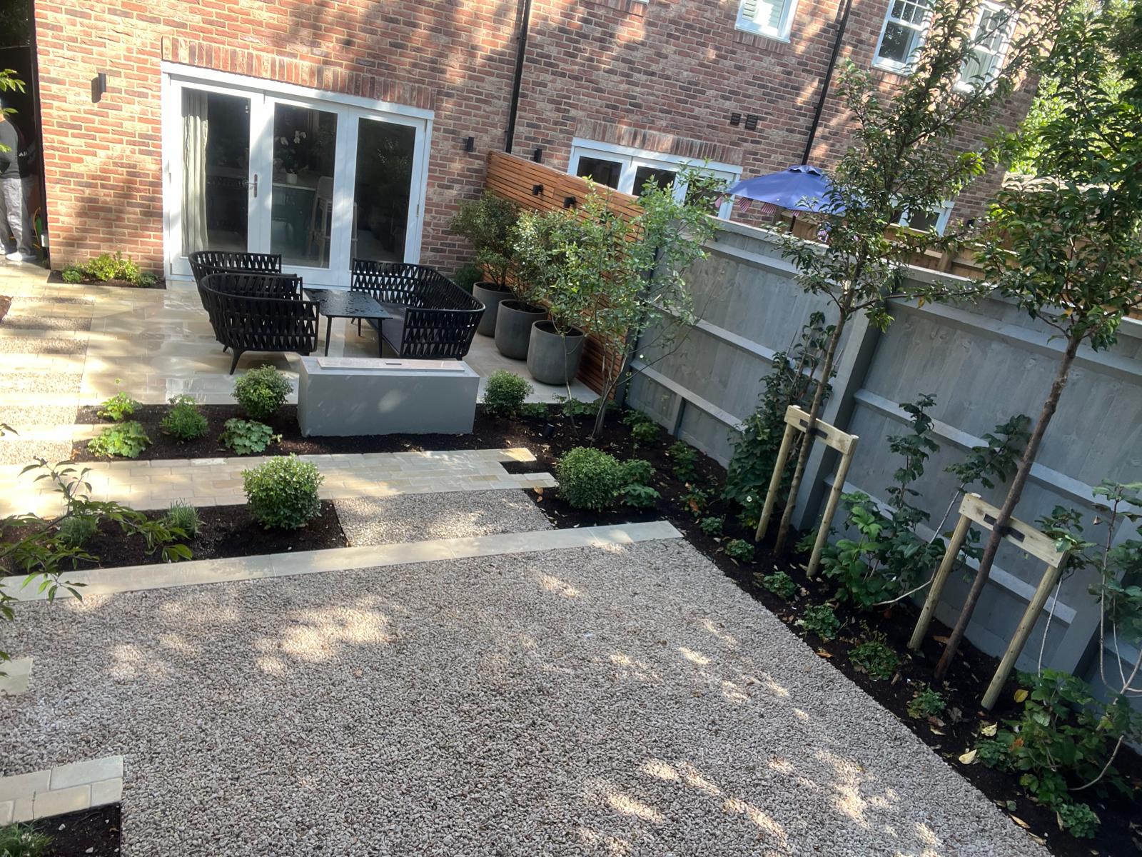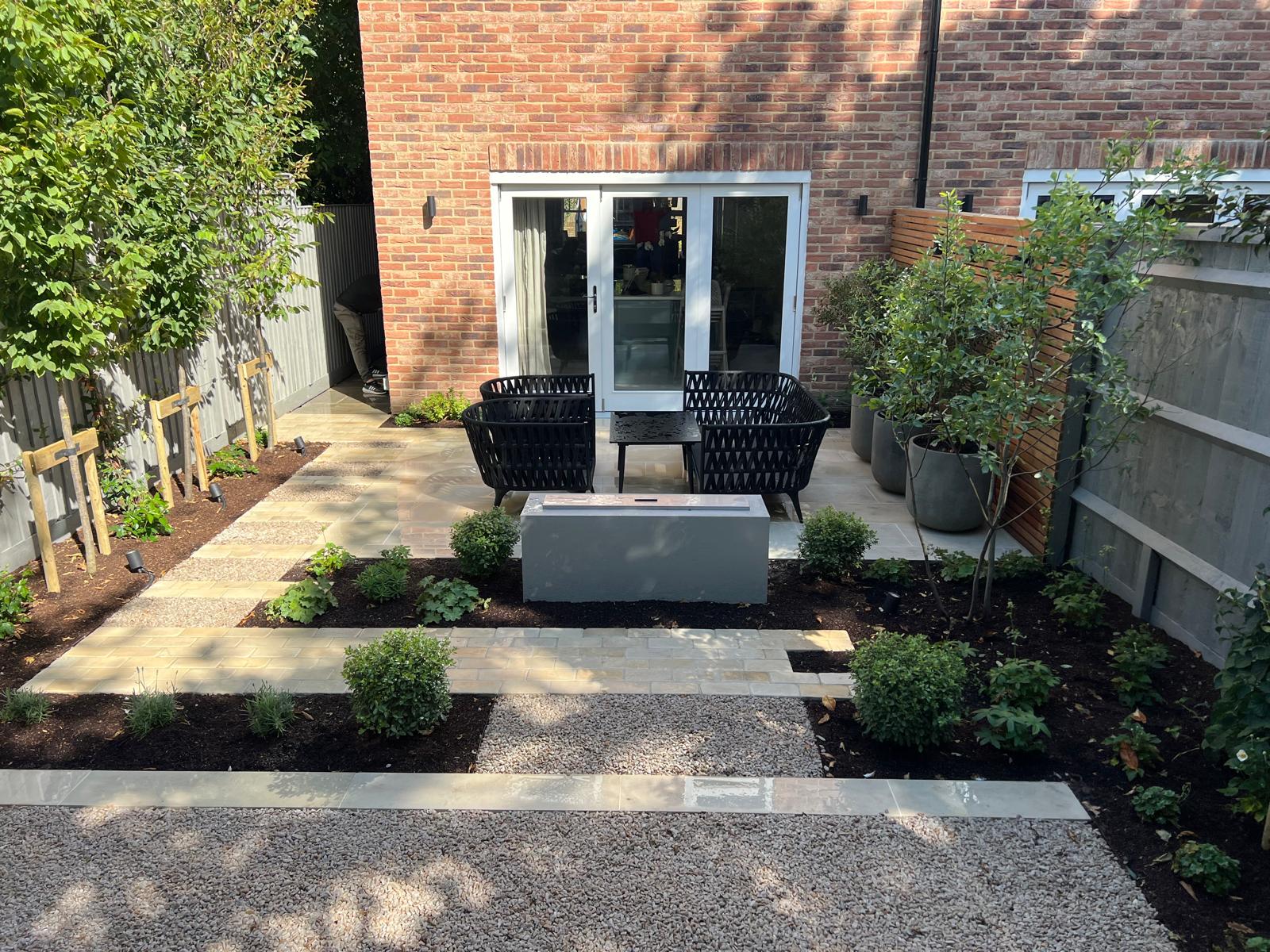 The planting scheme includes newly installed trees that provide structure, height and seasonal interest to the garden. These trees will mature beautifully over time, offering shade, privacy and a sense of maturity to the space. Complementary border planting softens the edges of the hard landscaping, introducing colour, texture and year-round appeal that frames the entertaining areas perfectly.