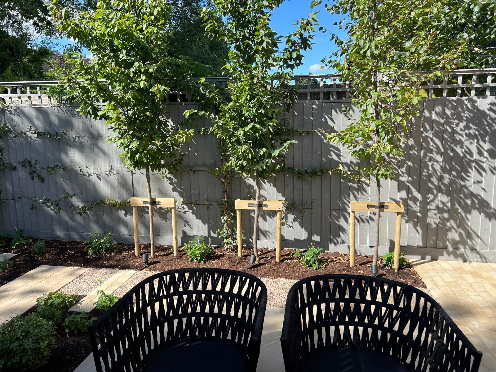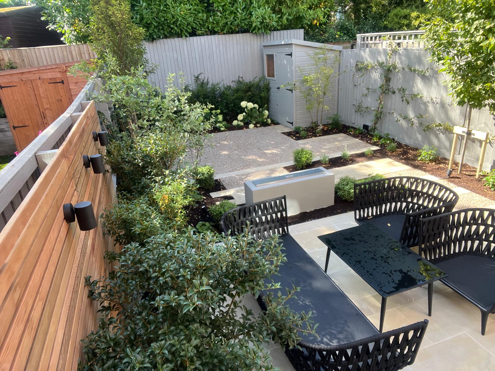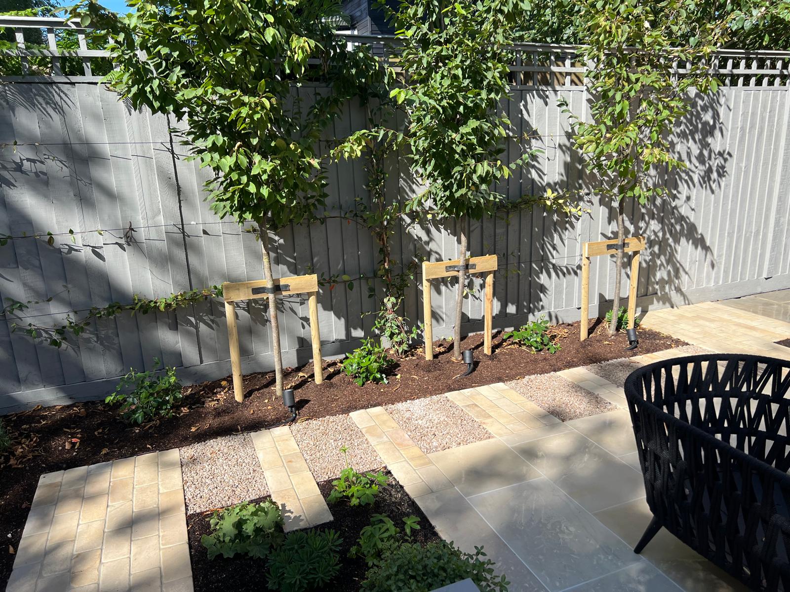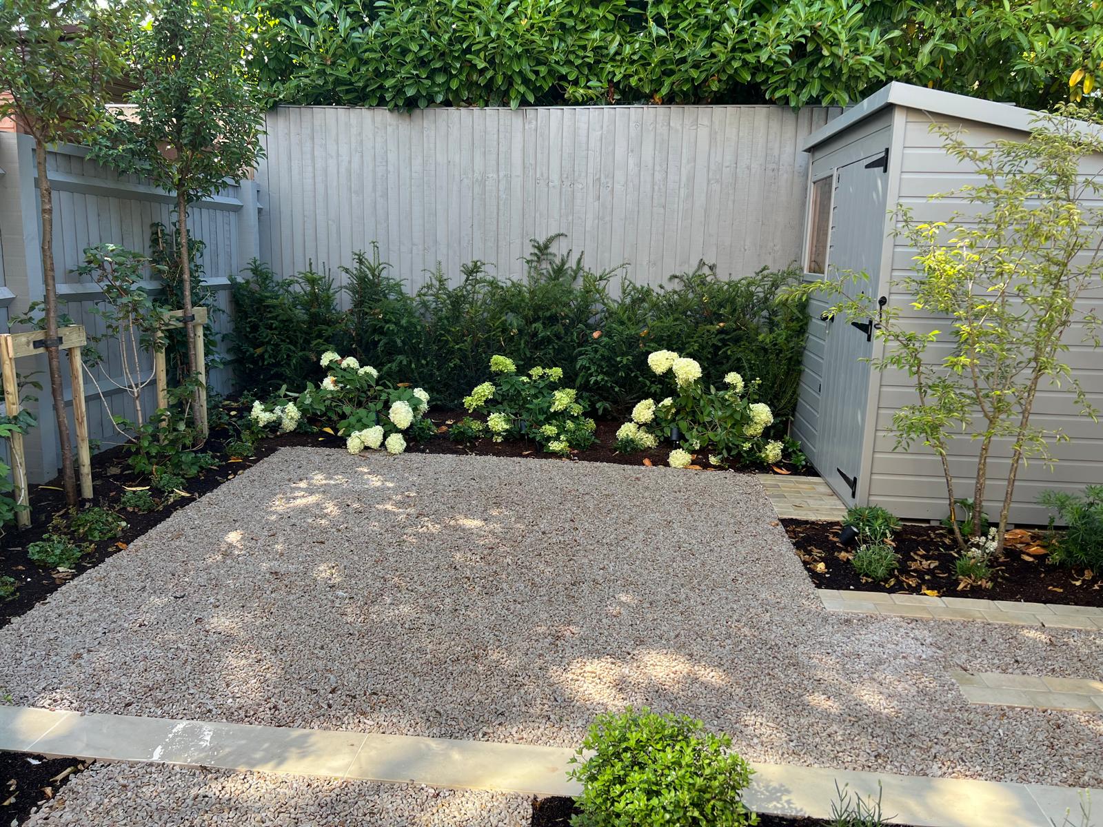 The planting scheme includes newly installed trees that provide structure, height and seasonal interest to the garden. These trees will mature beautifully over time, offering shade, privacy and a sense of maturity to the space. Complementary border planting softens the edges of the hard landscaping, introducing colour, texture and year-round appeal that frames the entertaining areas perfectly.