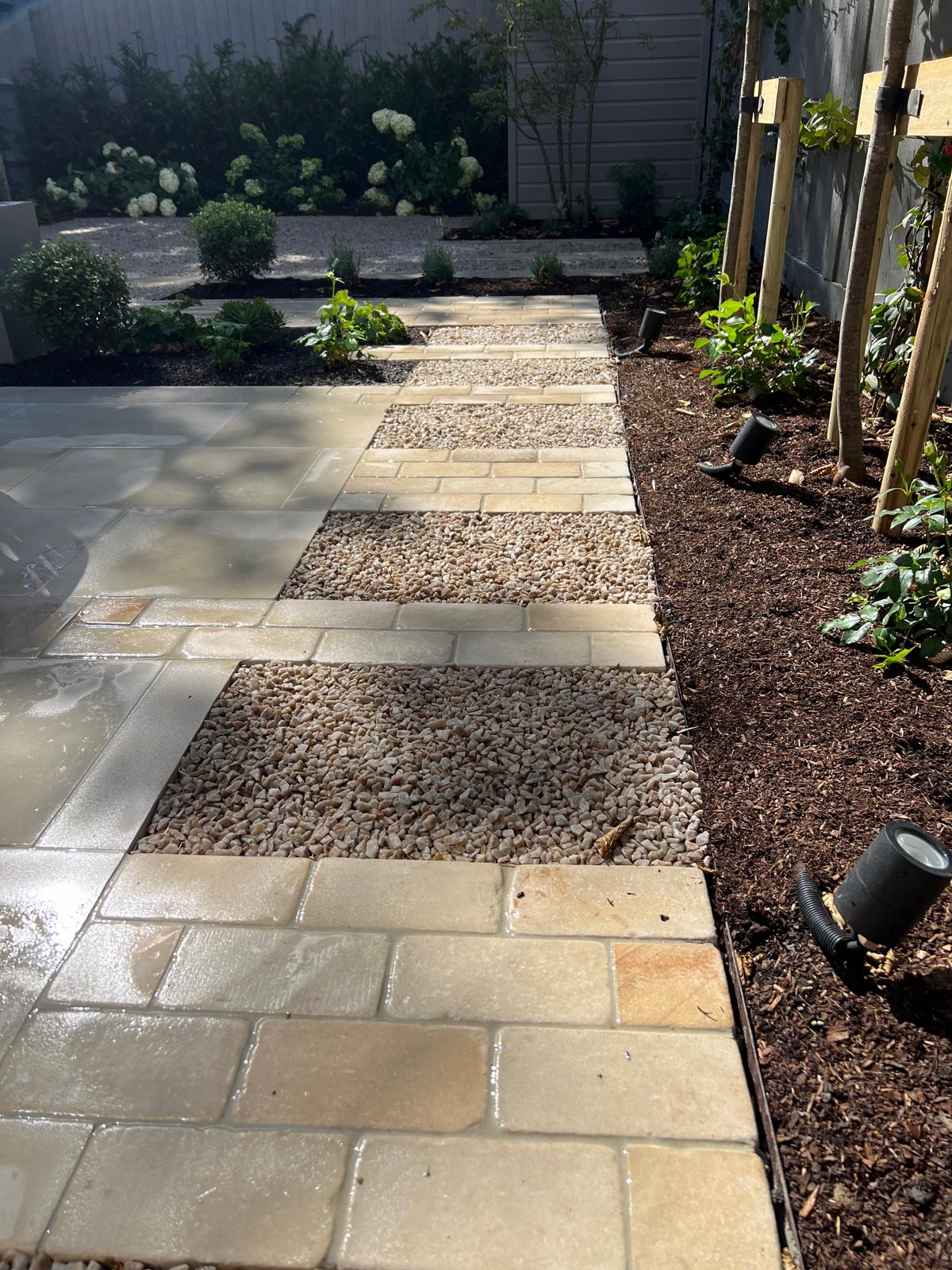 The centrepiece of the project is an expansive patio area, expertly constructed to provide generous space for outdoor living and dining. The patio was designed with entertaining in mind, offering ample room for elegant garden furniture and comfortable circulation around the space. The quality materials and precise installation create a level, attractive surface that connects beautifully with the property, forming a natural extension of the interior living areas.