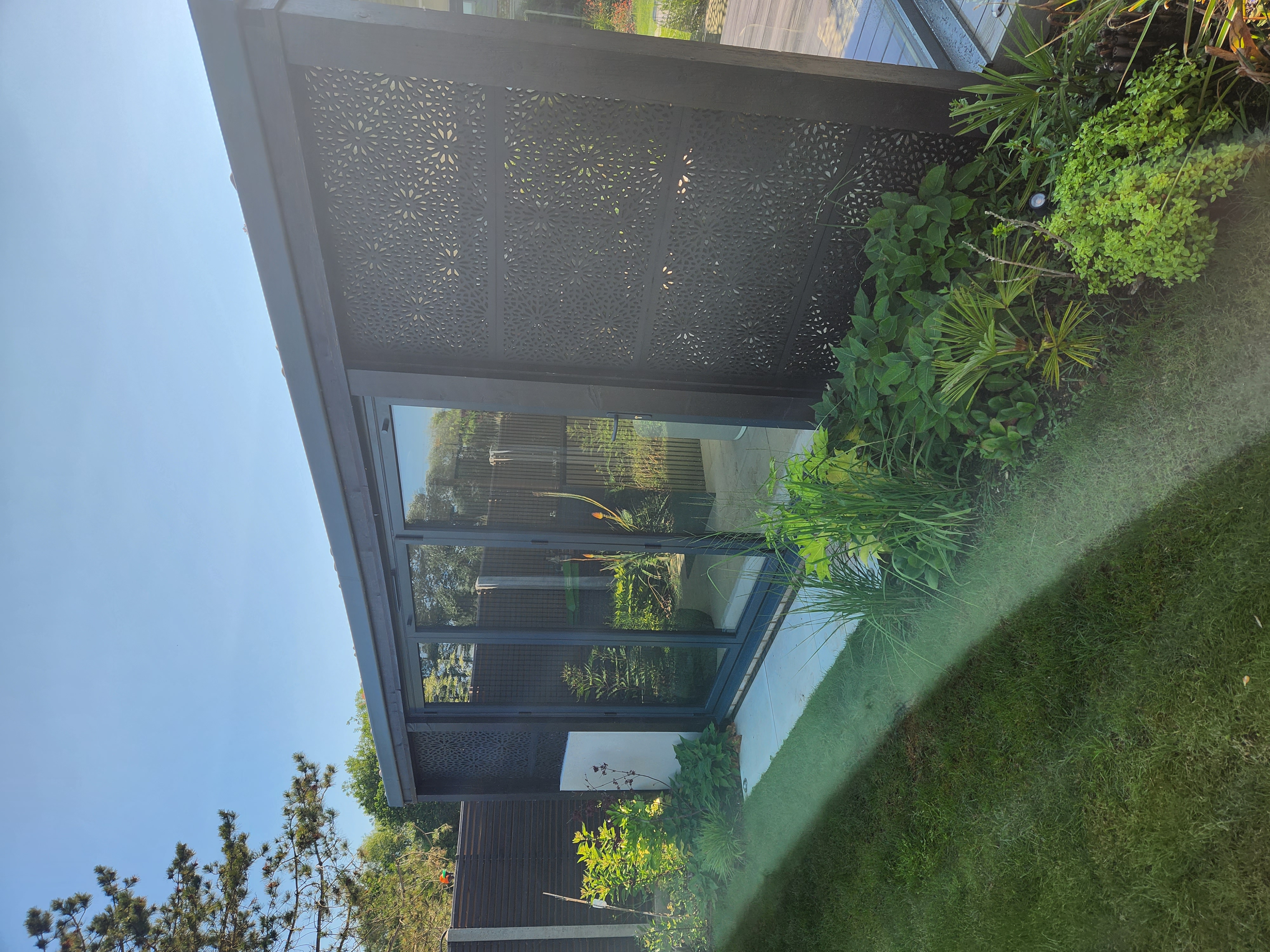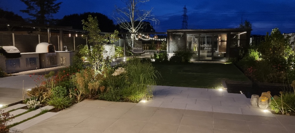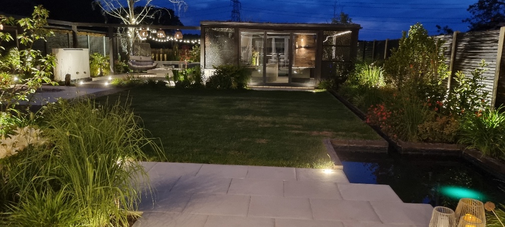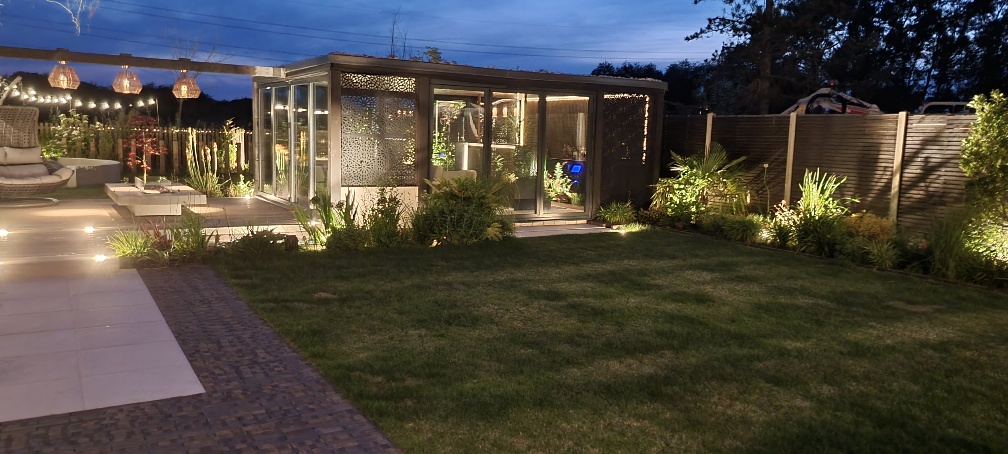 - Connect covered and open spaces – Use paving and lighting to link the garden building with surrounding areas, creating flow between sheltered and open zones rather than isolated features.