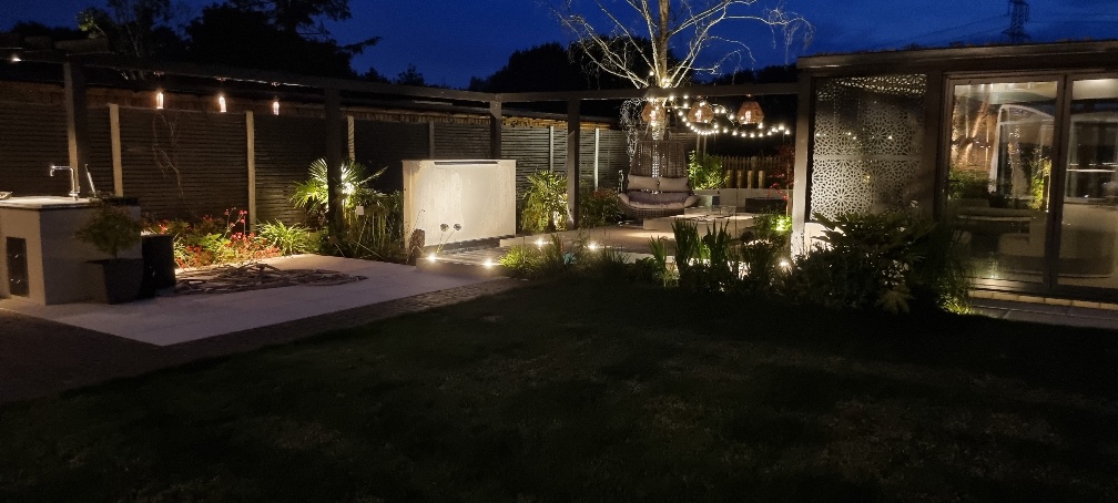 A carefully planned outdoor lighting scheme illuminates the space after dark, transforming the garden into an enchanting evening destination. The lighting highlights the architectural features of the garden building, provides practical illumination for the cooking area and creates ambient atmosphere throughout the entertaining space. This thoughtful lighting installation ensures the garden can be enjoyed long after sunset, dramatically extending its usability and appeal.