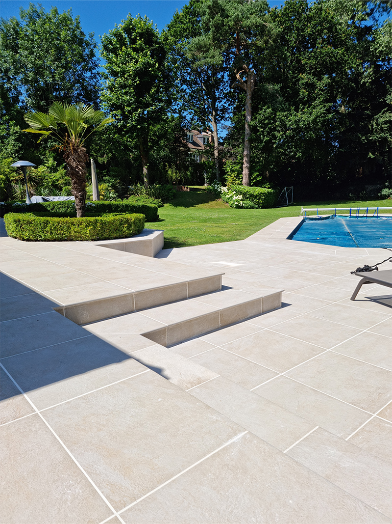 Thoughtfully designed stone steps provide level changes where needed, creating elegant transitions between different areas of the garden or pool surround. These steps are constructed from matching stone materials to maintain visual consistency, with careful attention paid to proportions, safety and water drainage to ensure they remain practical and attractive in this poolside environment.